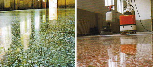通過專業(yè)拋光機械用拋光墊對地面進行整體高速拋磨 作業(yè)后,可形成具有大理石般光澤的水磨石地面。